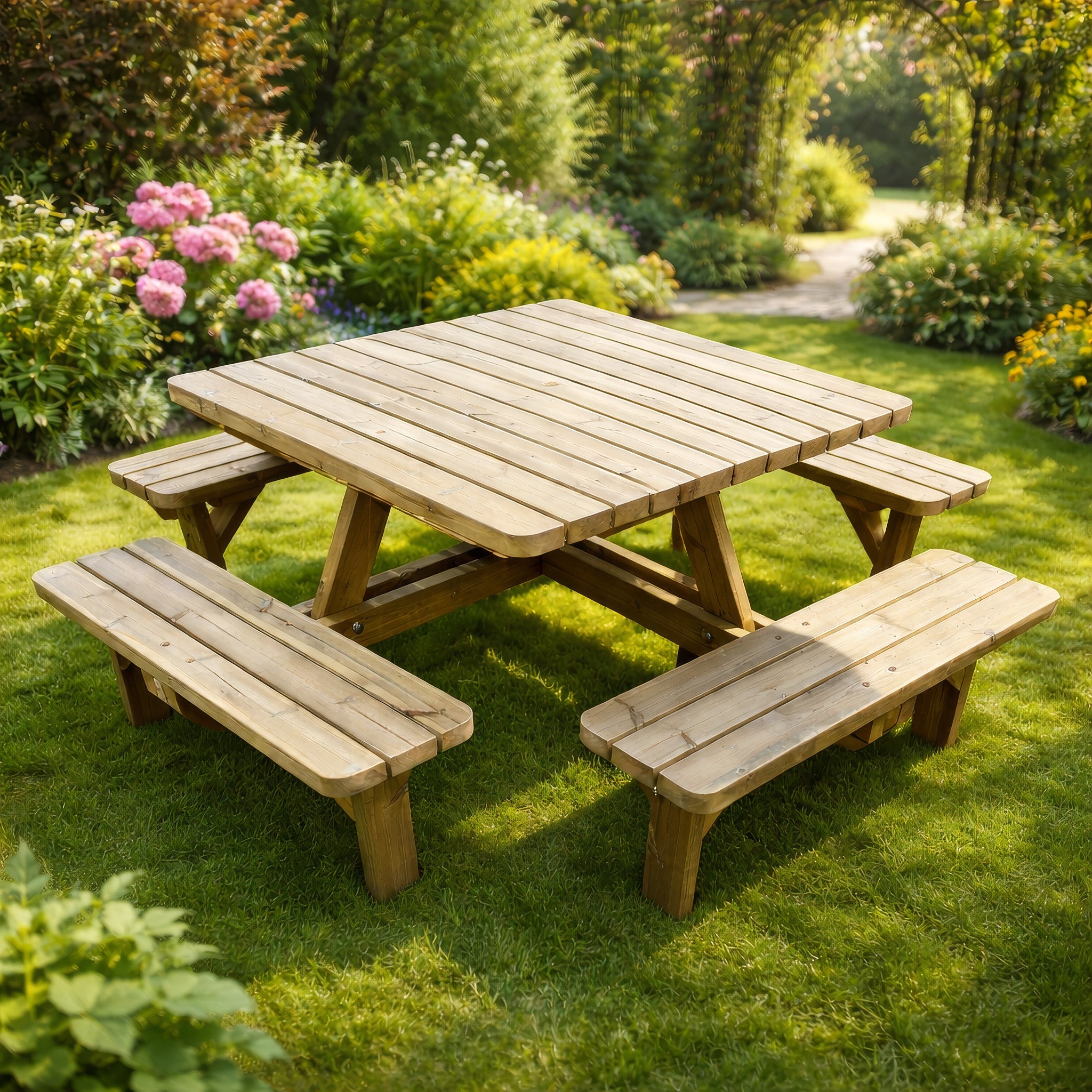 Transform your outdoor space with the handcrafted, UK-made Braunston 8-seater square picnic table.