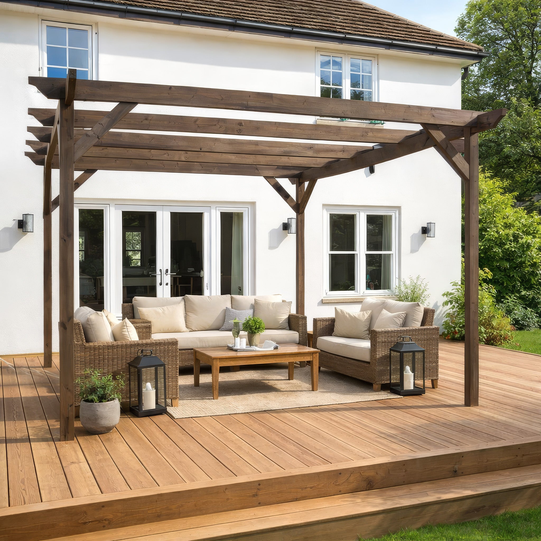 Crafted from pressure-treated Northern European redwood, our freestanding garden pergola combines strength, durability, and timeless style - featuring beautifully sculpted rafter and runner ends for a more traditional, decorative finish.