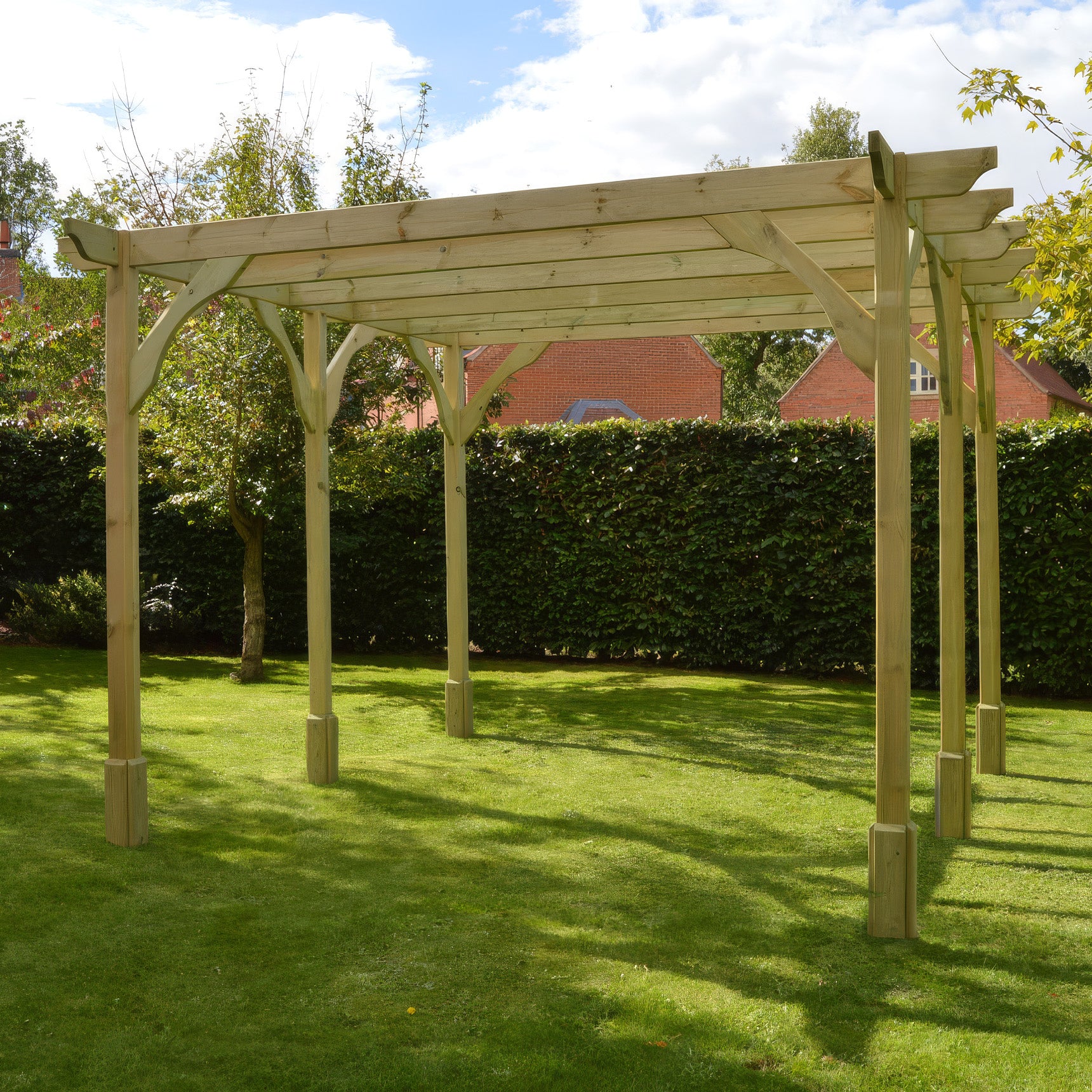 Crafted from pressure-treated Northern European redwood, our premium pergola combines strength, durability, and a clean, modern contemporary look-featuring a sculpted rafter design that enhances its overall visual appeal and presence in any outdoor space.