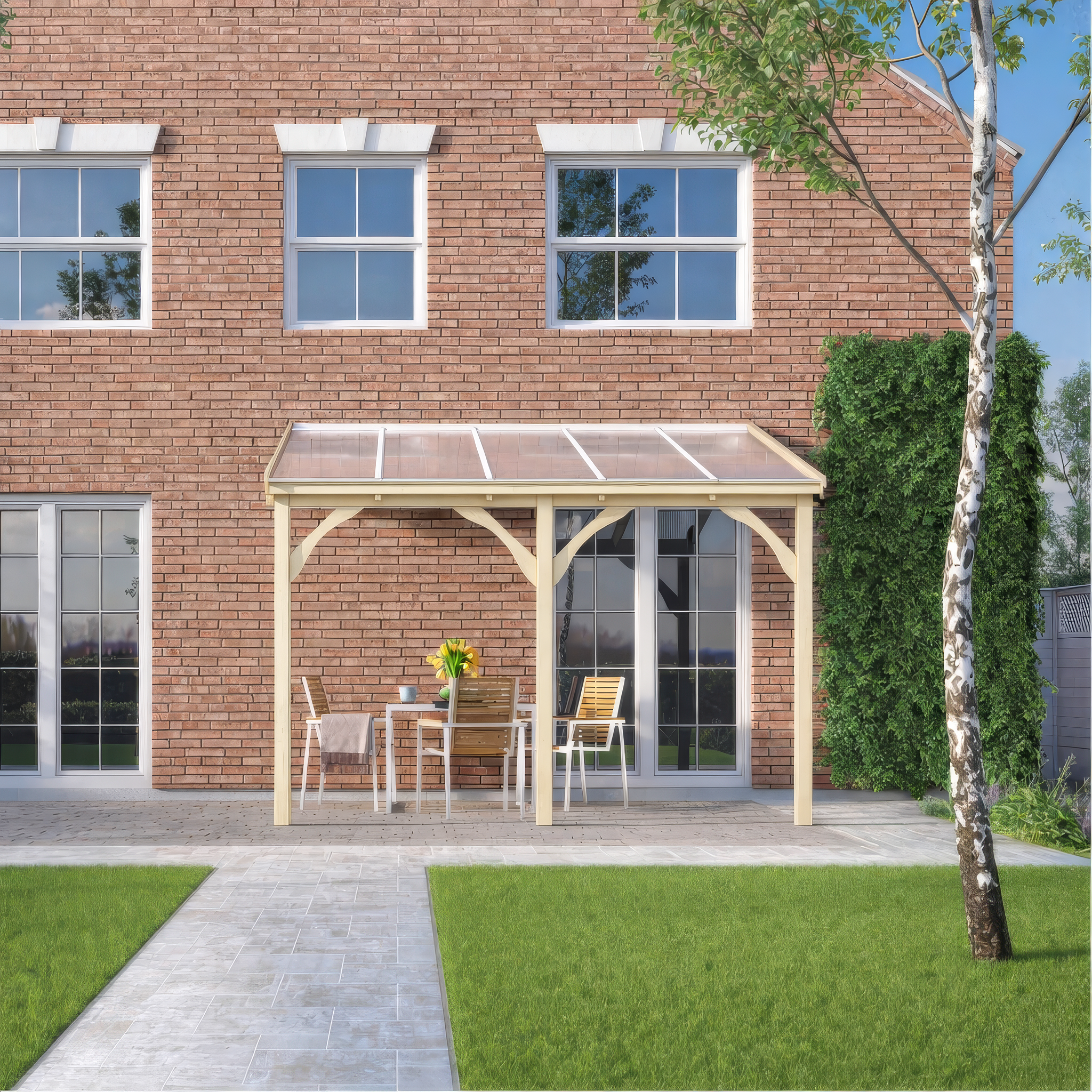 The roof design delivers excellent shelter while creating a bold and attractive feature against your property. Stylish curved corner braces enhance both structural integrity and visual appeal, adding a touch of elegance to the overall design. The polycarbonate roof system is available with a choice of three roof sheet colours and two glazing bar finishes, allowing you to tailor the look to perfectly complement your home and garden.